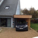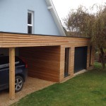 Carport et garage à toit plat avec un bardage à claire-voie.