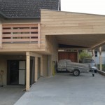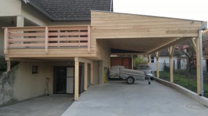 Carport pour voiture sur deux niveaux avec terrasse sur l’un et toiture un versant sur l’autre.