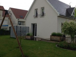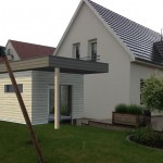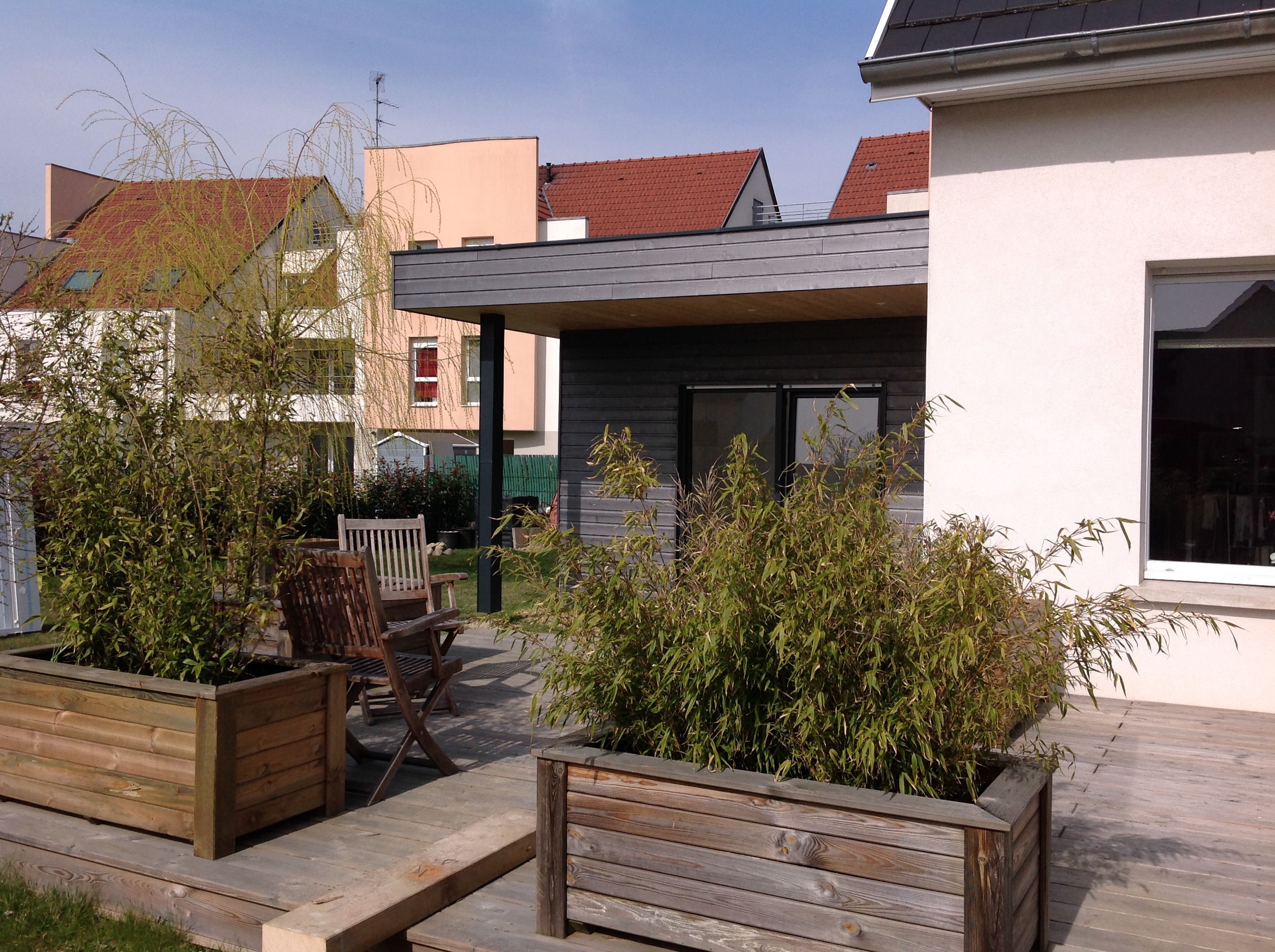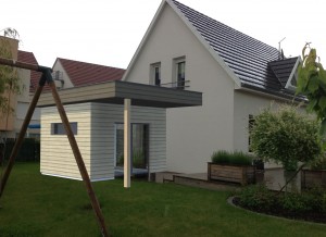 Extension à toit plat servant de véranda pour l’été en continuité du bâtiment existant.