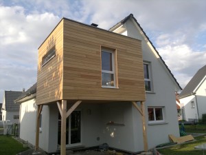 Extension de maison à toit plat en étage avec bardage intégral sur pilotis permettant l’aménagement du rez-de-chaussée avec une véranda.