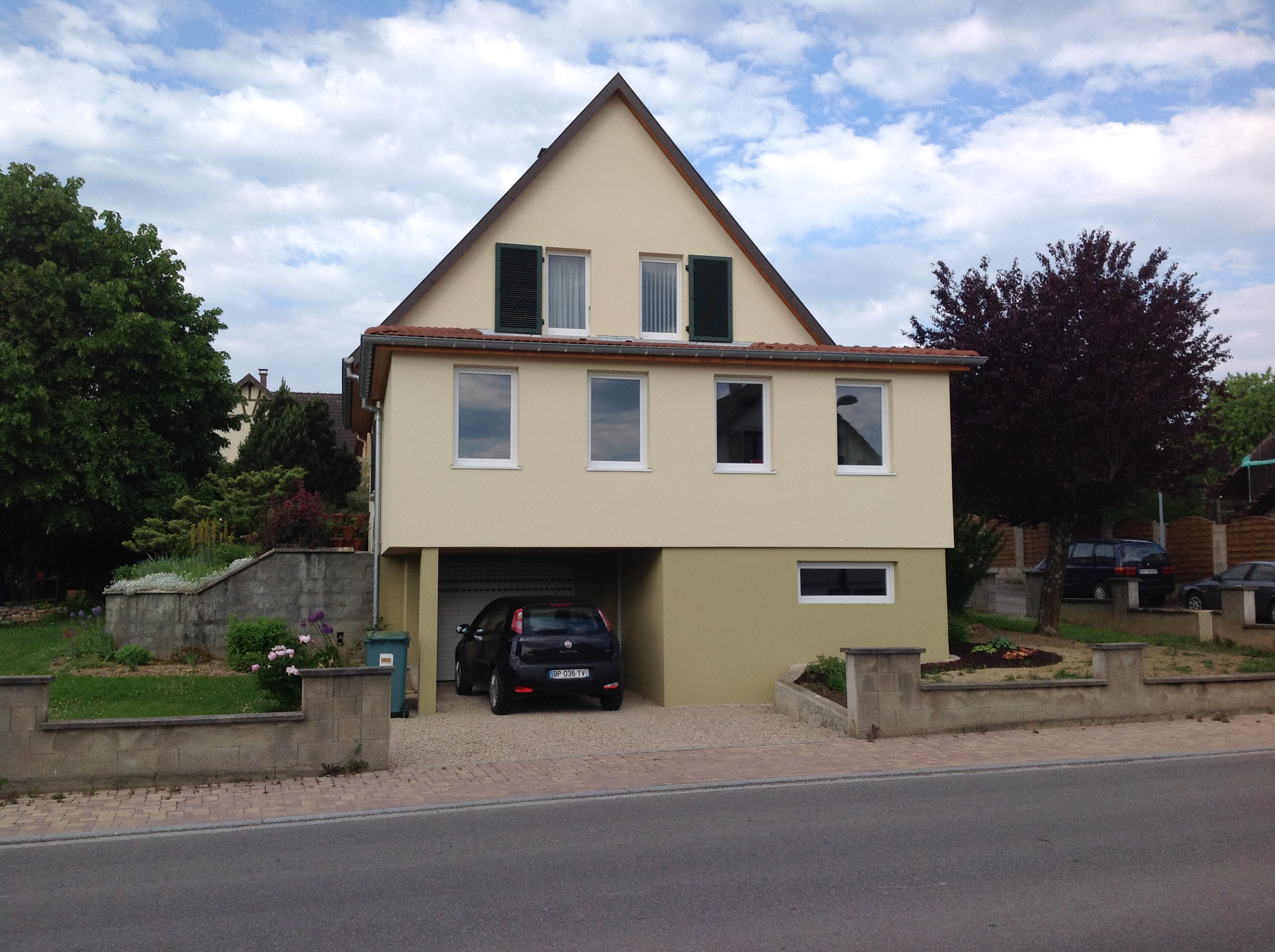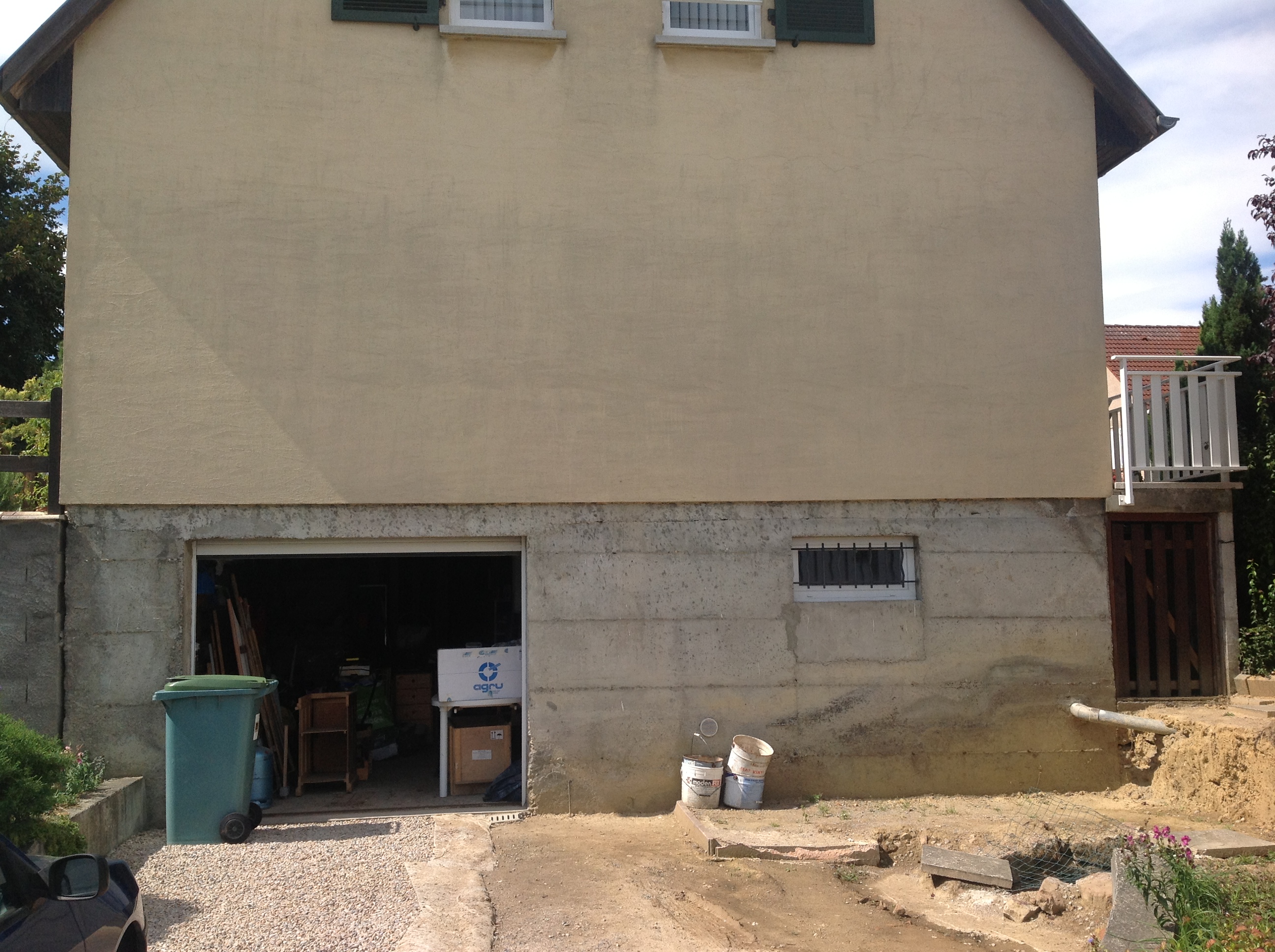 Extension de maison avec rez-de-chaussée en brique et béton, et étage entièrement en ossature bois.