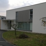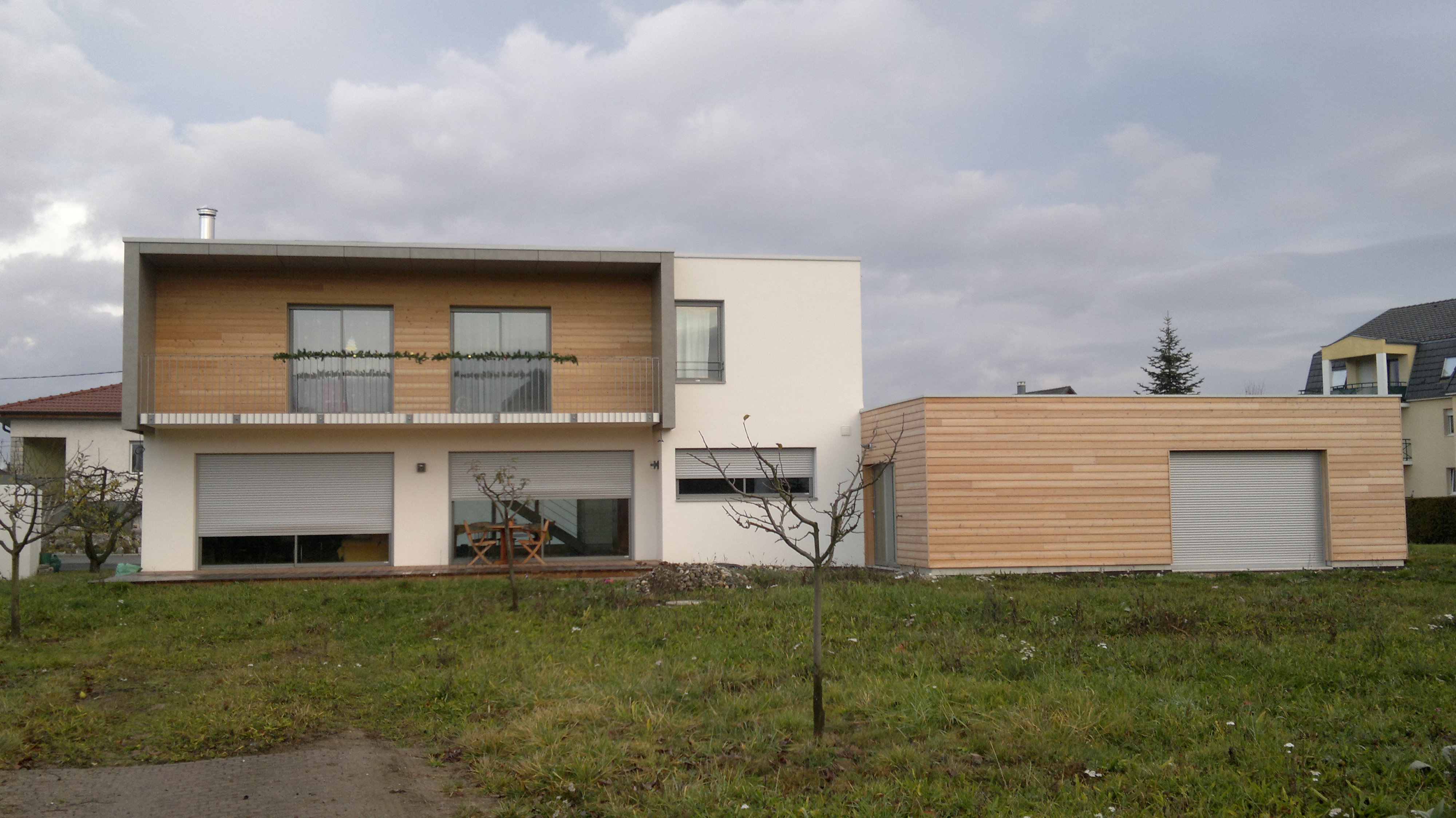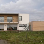 Maison à ossature bois, à toit plat, avec mixité bardage en mélèze, crépis et plaque métallique