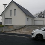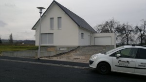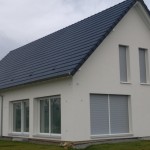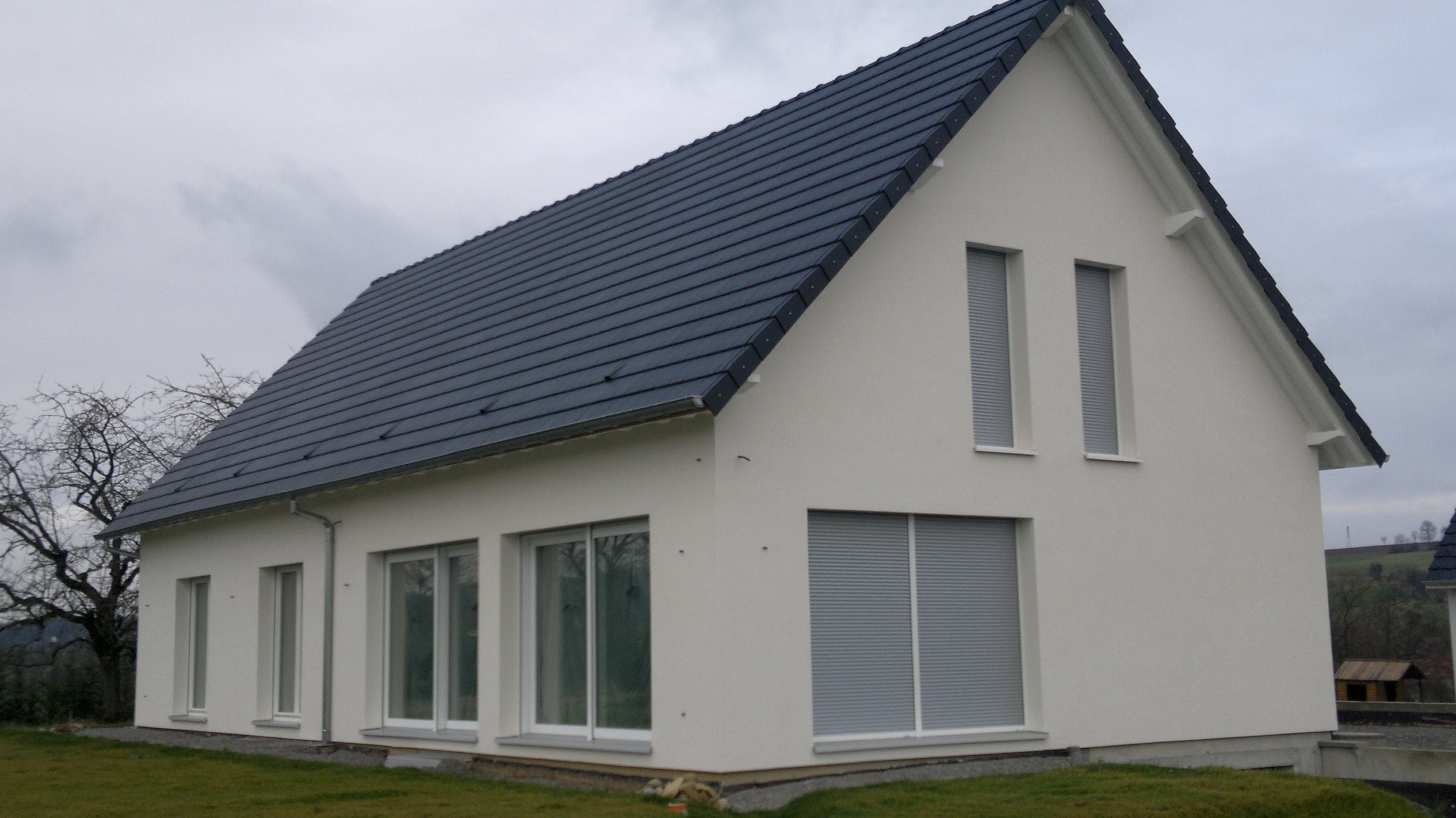 La particularité de cette maison en ossature bois est que les caissons des volets roulants sont intégrés dans le mur. De la maison est équipée de volet électrique.