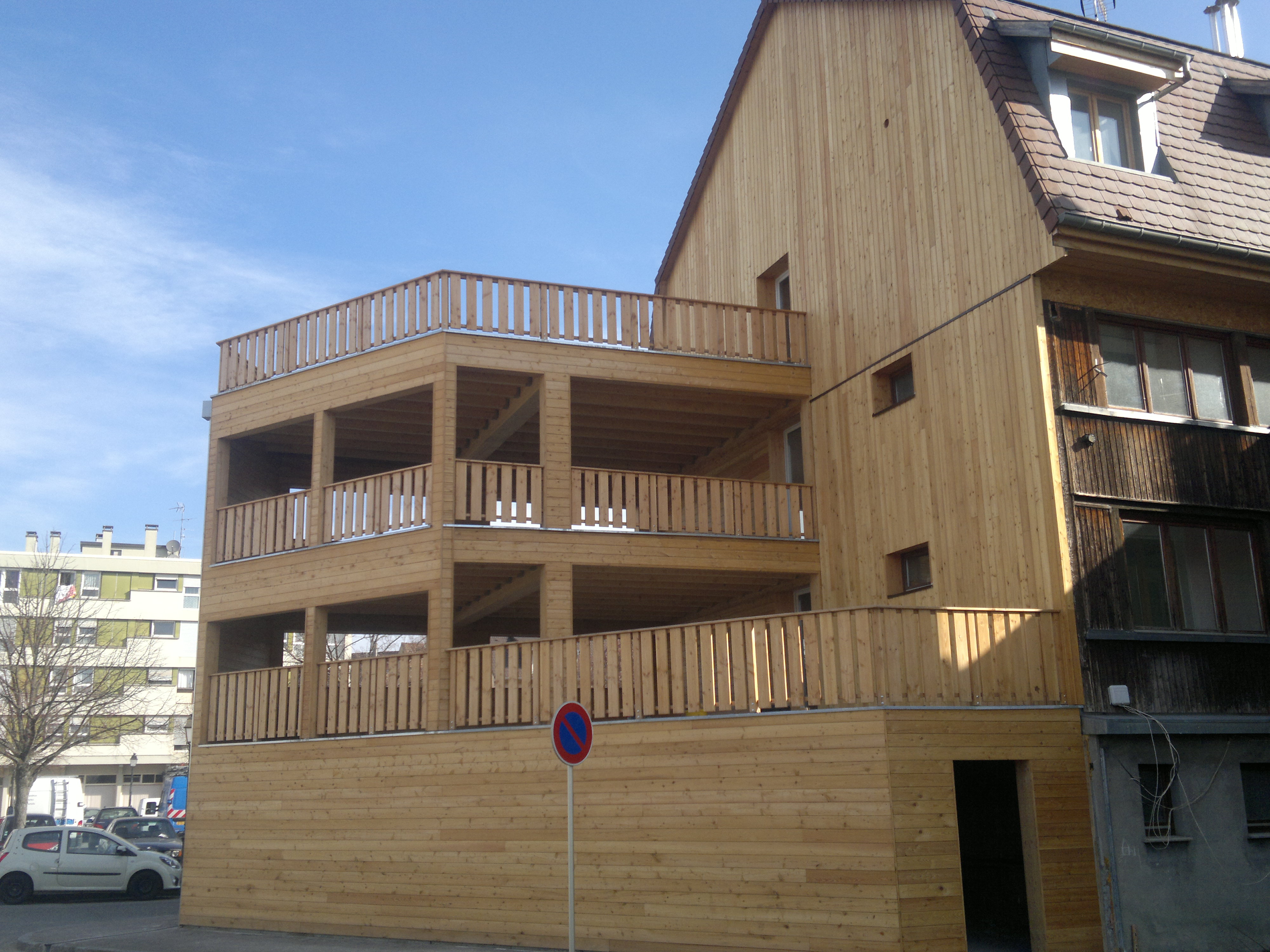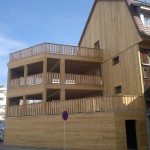 Le bois est apparents en Douglas pour les solives, le bardage, les lames de terrasse, les escaliers et les gardes-corps.