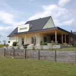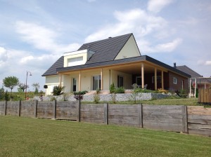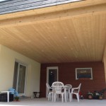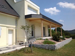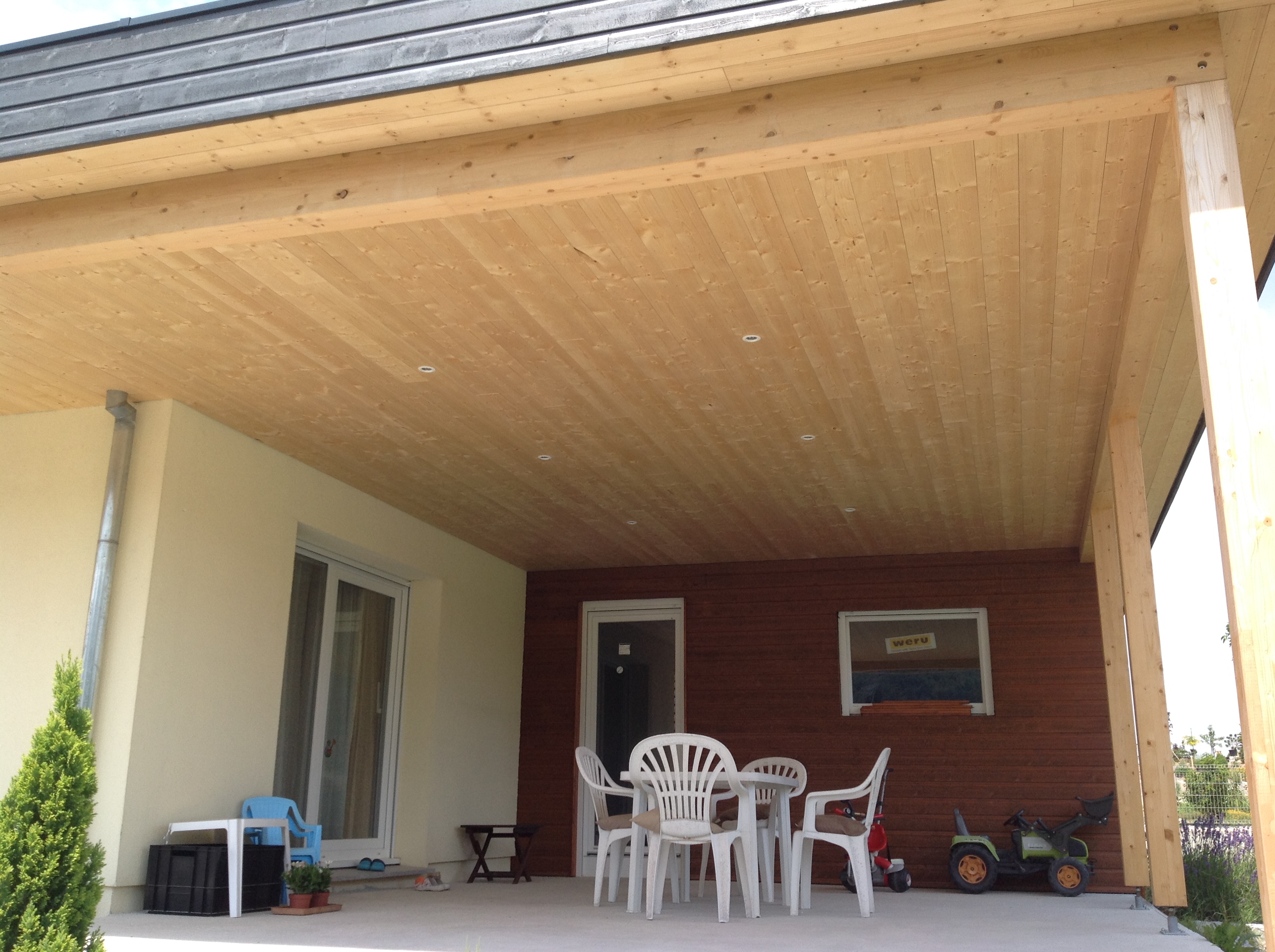 Les poteaux sont apparents en Douglas et la finition en sous-face est du parquet renversé.