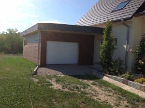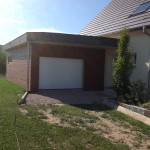 Garage attenant de surface 30.00 m² avec bardage en fibre ciment et une porte de garage sectionnelle motorisée.